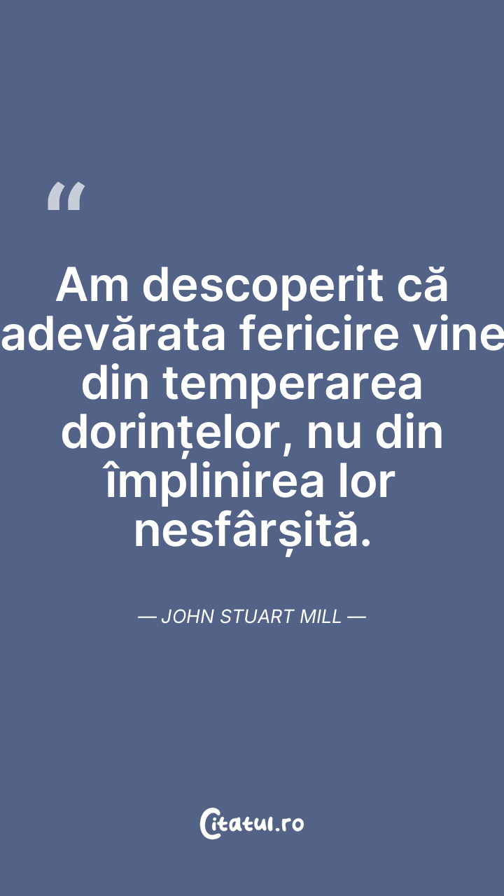 Am descoperit că adevărata fericire vine din temperarea dorințelor, nu din împlinirea lor nesfârșită. John Stuart Mill