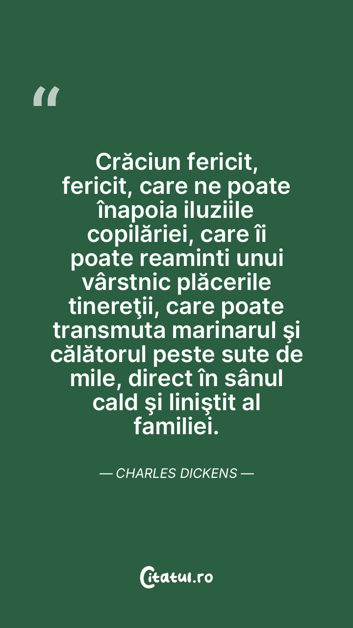 Crăciun fericit, fericit, care ne poate înapoia iluziile copilăriei, care îi poate reaminti unui vârstnic plăcerile tinereţii, care poate transmuta marinarul şi călătorul peste sute de mile, direct în sânul cald şi liniştit al familiei. Charles Dickens