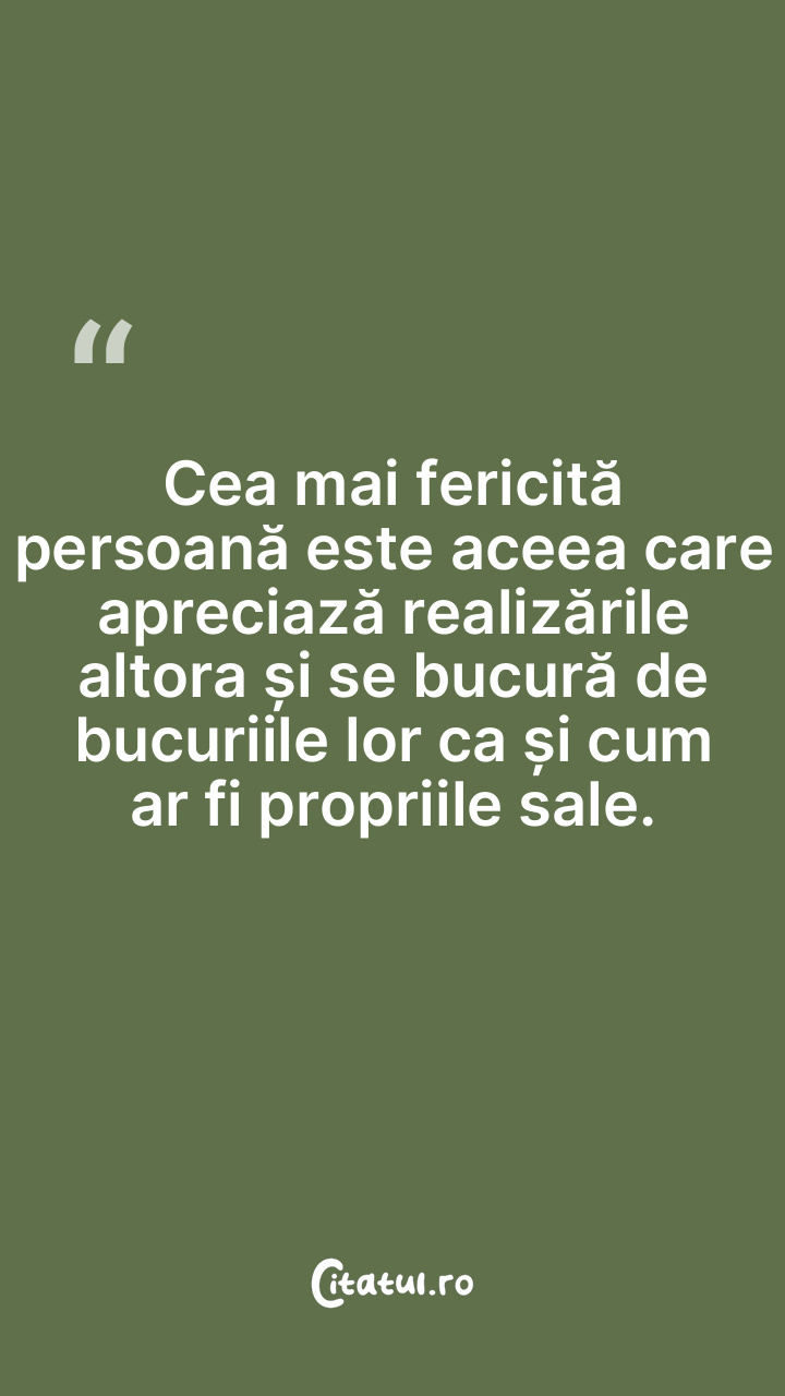 Cea mai fericită persoană este aceea care apreciază realizările altora și se bucură de bucuriile lor ca și cum ar fi propriile sale.