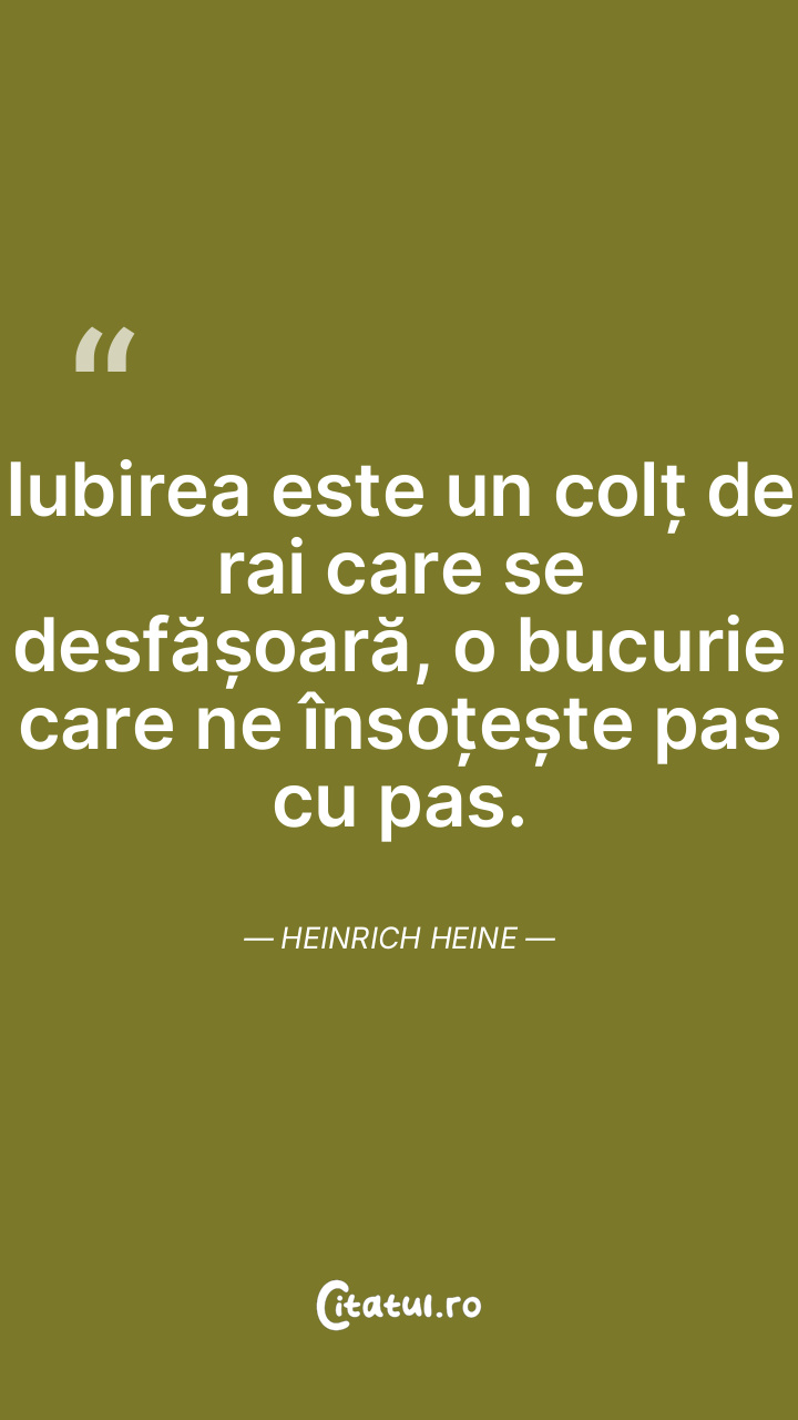 Iubirea este un colț de rai care se desfășoară, o bucurie care ne însoțește pas cu pas. Heinrich Heine