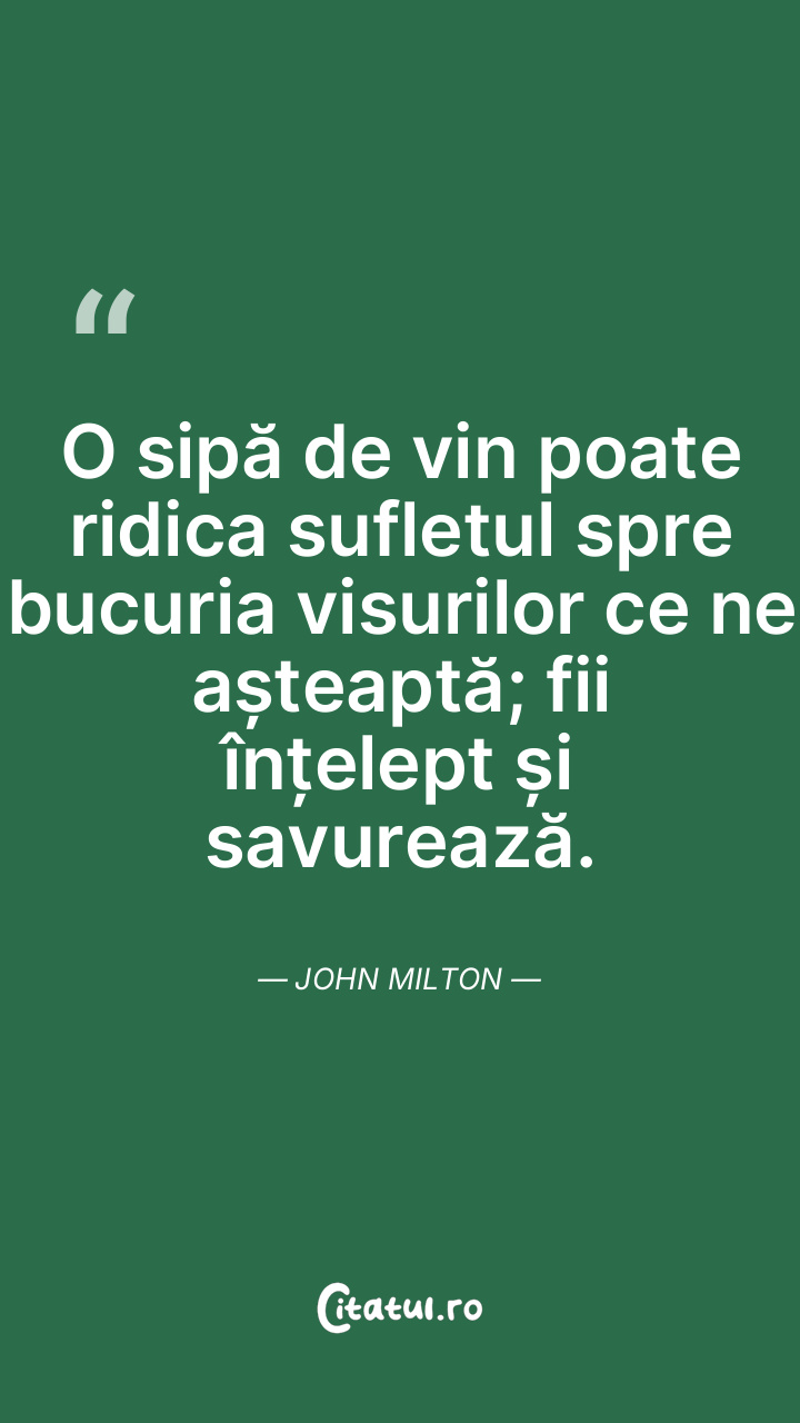 O sipă de vin poate ridica sufletul spre bucuria visurilor ce ne așteaptă; fii înțelept și savurează. John Milton