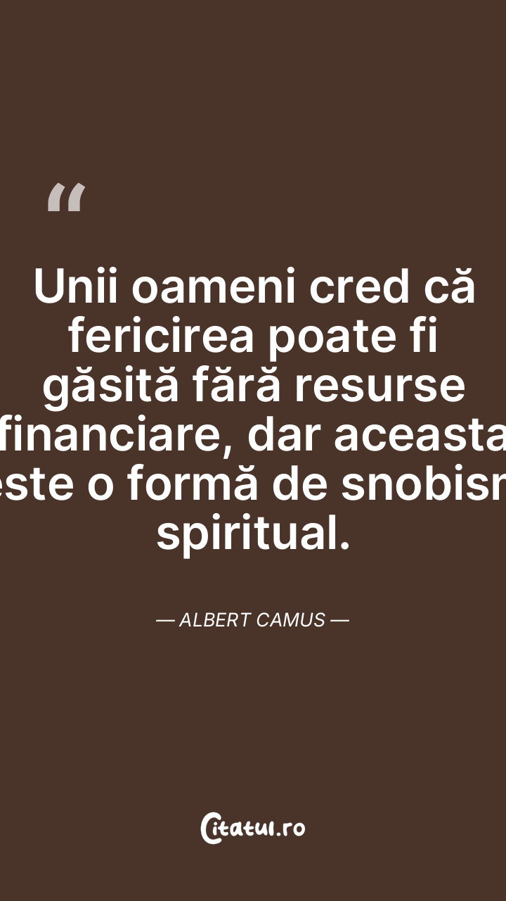 Unii oameni cred că fericirea poate fi găsită fără resurse financiare, dar aceasta este o formă de snobism spiritual. Albert Camus