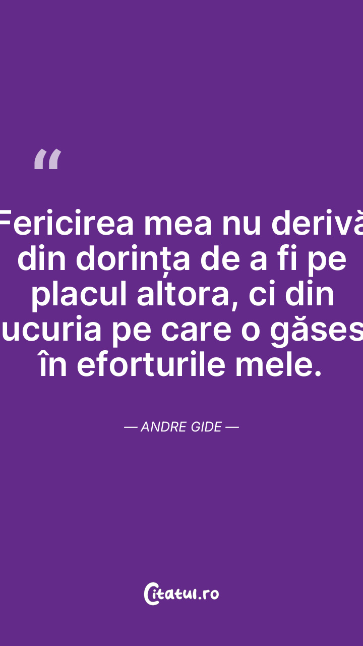 Fericirea mea nu derivă din dorința de a fi pe placul altora, ci din bucuria pe care o găsesc în eforturile mele. Andre Gide