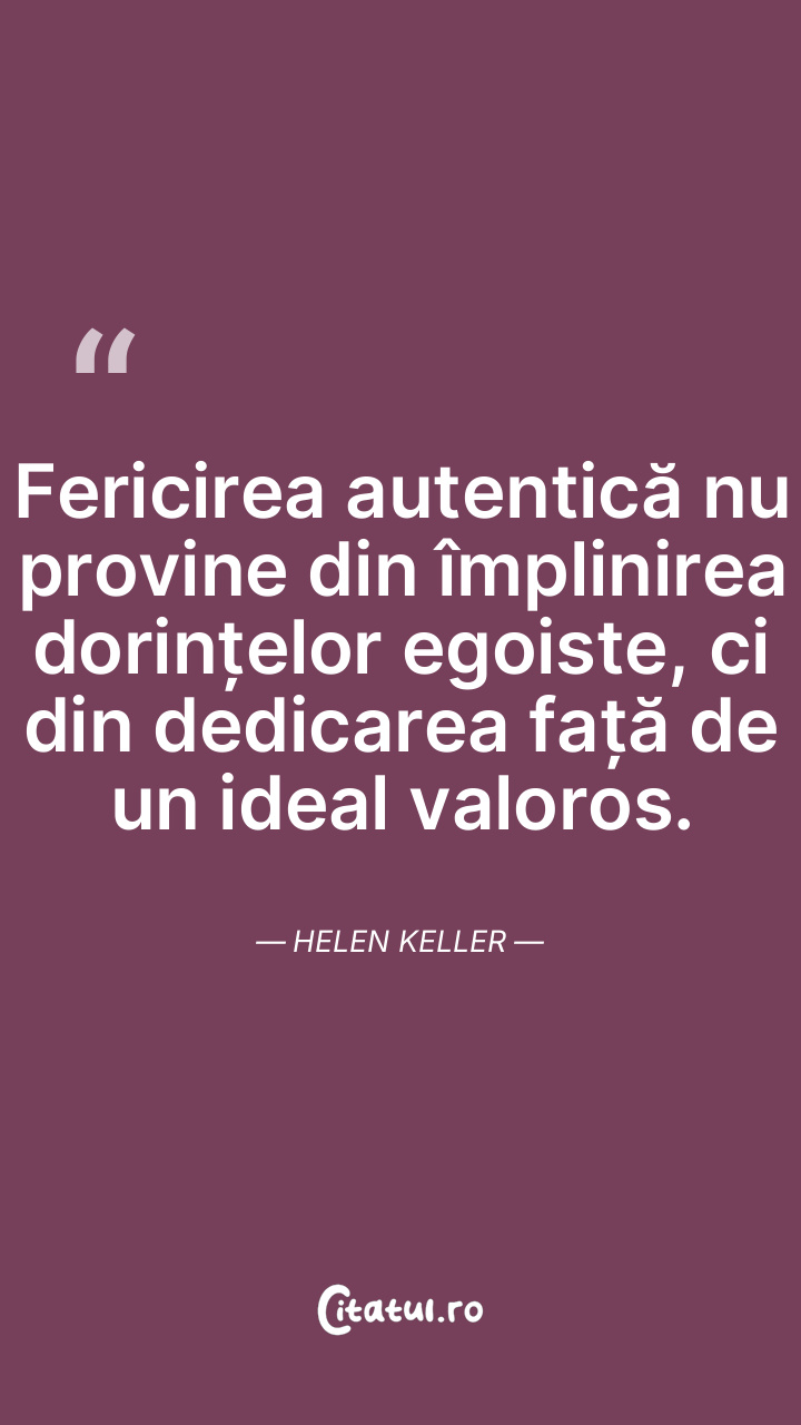 Fericirea autentică nu provine din împlinirea dorințelor egoiste, ci din dedicarea față de un ideal valoros. Helen Keller