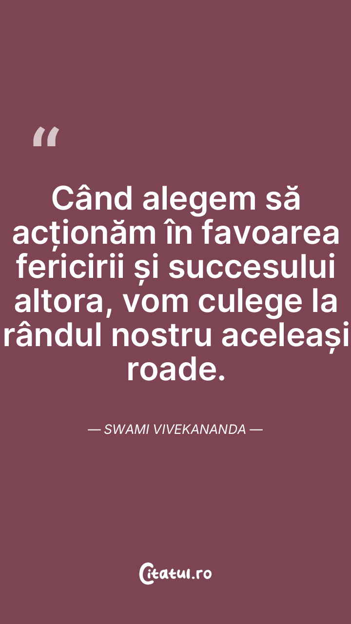 Când alegem să acționăm în favoarea fericirii și succesului altora, vom culege la rândul nostru aceleași roade. Swami Vivekananda