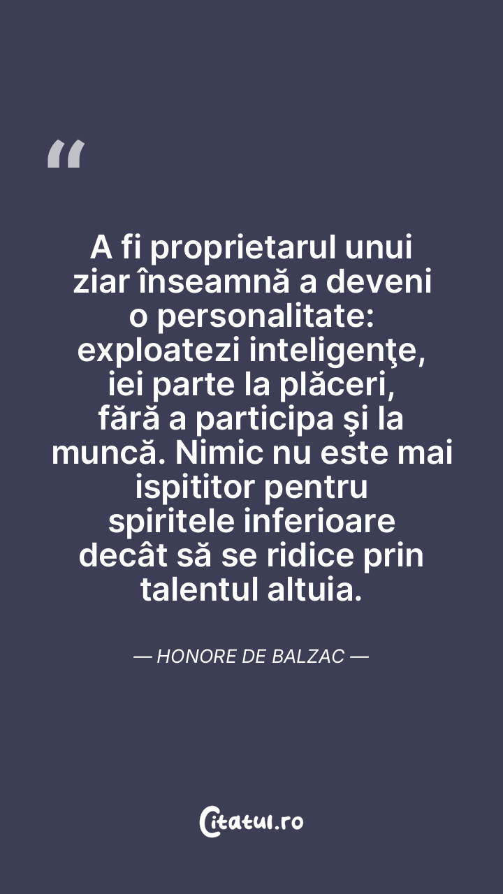 A fi proprietarul unui ziar înseamnă a deveni o personalitate: exploatezi inteligenţe, iei parte la plăceri, fără a participa şi la muncă. Nimic nu este mai ispititor pentru spiritele inferioare decât să se ridice prin talentul altuia. Honore de Balzac