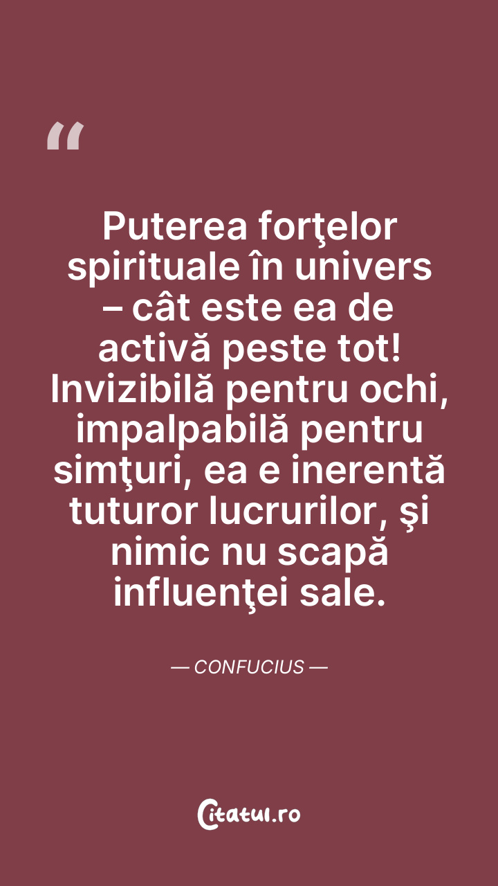 Puterea forţelor spirituale în univers – cât este ea de activă peste tot! Invizibilă pentru ochi, impalpabilă pentru simţuri, ea e inerentă tuturor lucrurilor, şi nimic nu scapă influenţei sale. Confucius