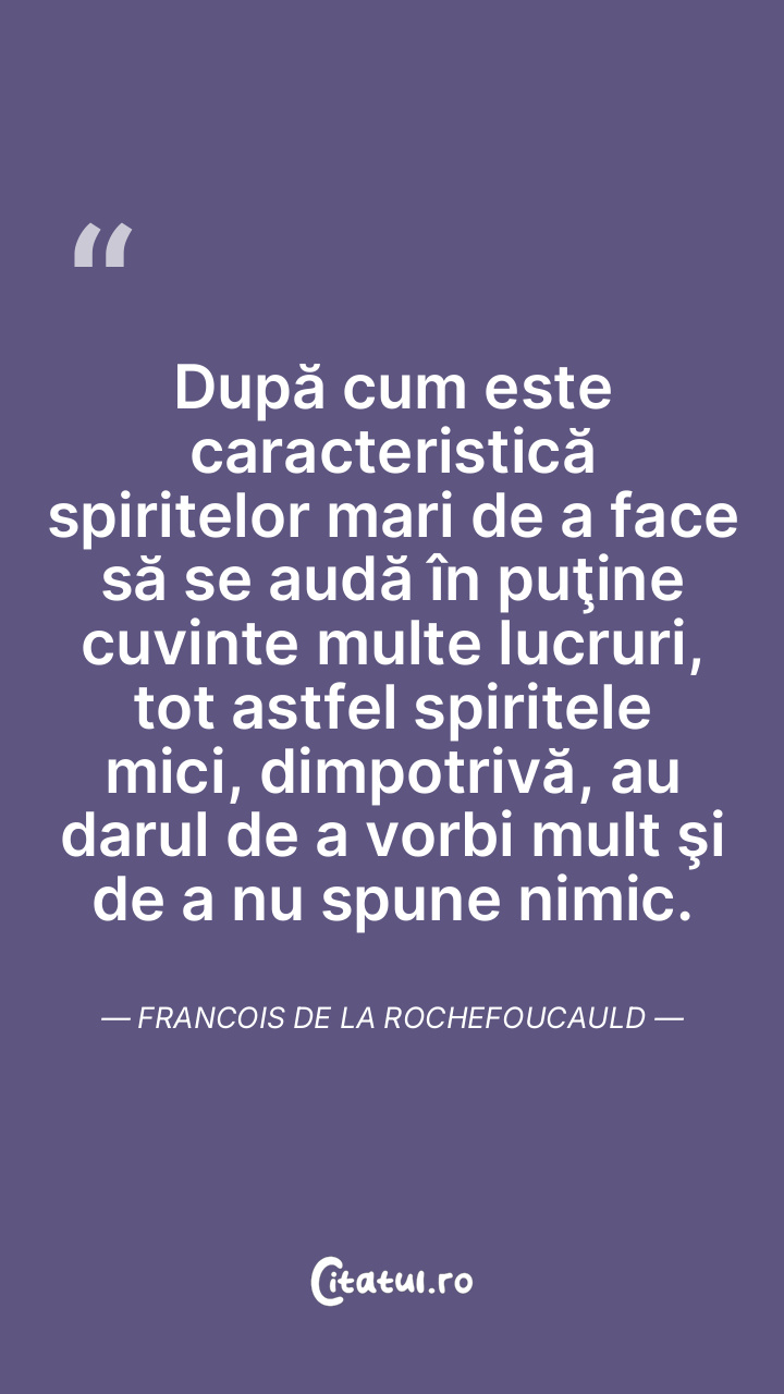 După cum este caracteristică spiritelor mari de a face să se audă în puţine cuvinte multe lucruri, tot astfel spiritele mici, dimpotrivă, au darul de a vorbi mult şi de a nu spune nimic. Francois de la Rochefoucauld