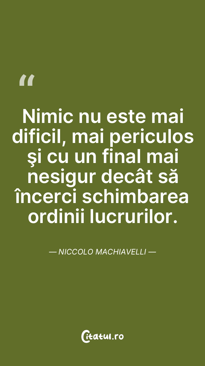 Nimic nu este mai dificil, mai periculos şi cu un final mai nesigur decât să încerci schimbarea ordinii lucrurilor. Niccolo Machiavelli