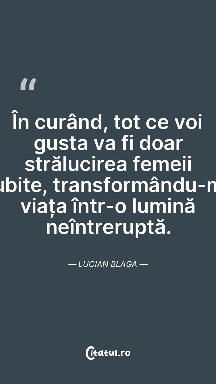 În curând, tot ce voi gusta va fi doar strălucirea femeii iubite, transformându-mi viața într-o lumină neîntreruptă. Lucian Blaga