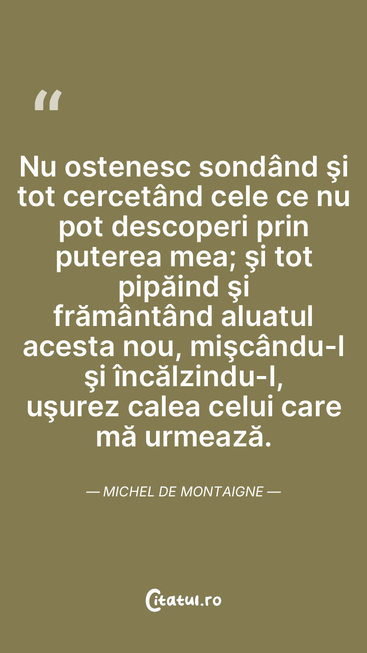Nu ostenesc sondând şi tot cercetând cele ce nu pot descoperi prin puterea mea; şi tot pipăind şi frământând aluatul acesta nou, mişcându-l şi încălzindu-l, uşurez calea celui care mă urmează. Michel de Montaigne
