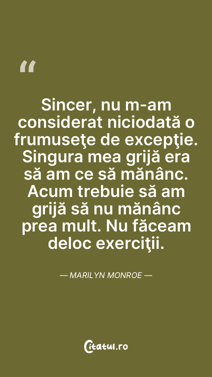 Sincer, nu m-am considerat niciodată o frumuseţe de excepţie. Singura mea grijă era să am ce să mănânc. Acum trebuie să am grijă să nu mănânc prea mult. Nu făceam deloc exerciţii. Marilyn Monroe
