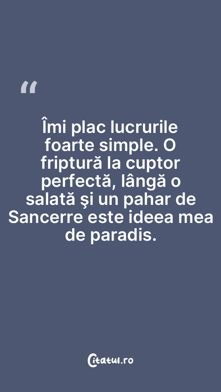 Îmi plac lucrurile foarte simple. O friptură la cuptor perfectă, lângă o salată şi un pahar de Sancerre este ideea mea de paradis.