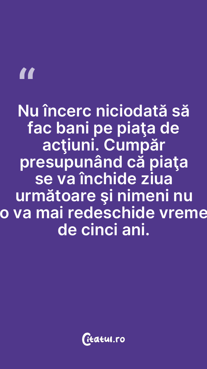 Nu încerc niciodată să fac bani pe piaţa de acţiuni. Cumpăr presupunând că piaţa se va închide ziua următoare şi nimeni nu o va mai redeschide vreme de cinci ani.