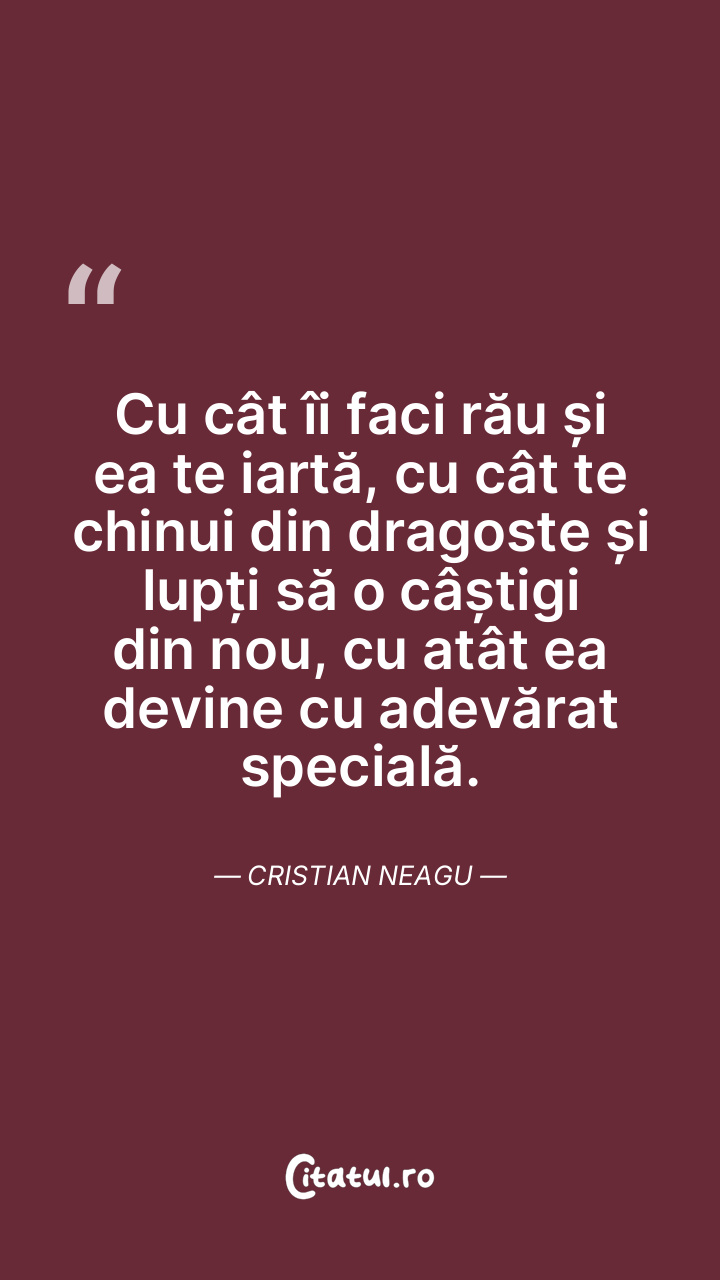 Cu cât îi faci rău și ea te iartă, cu cât te chinui din dragoste și lupți să o câștigi din nou, cu atât ea devine cu adevărat specială. Cristian Neagu