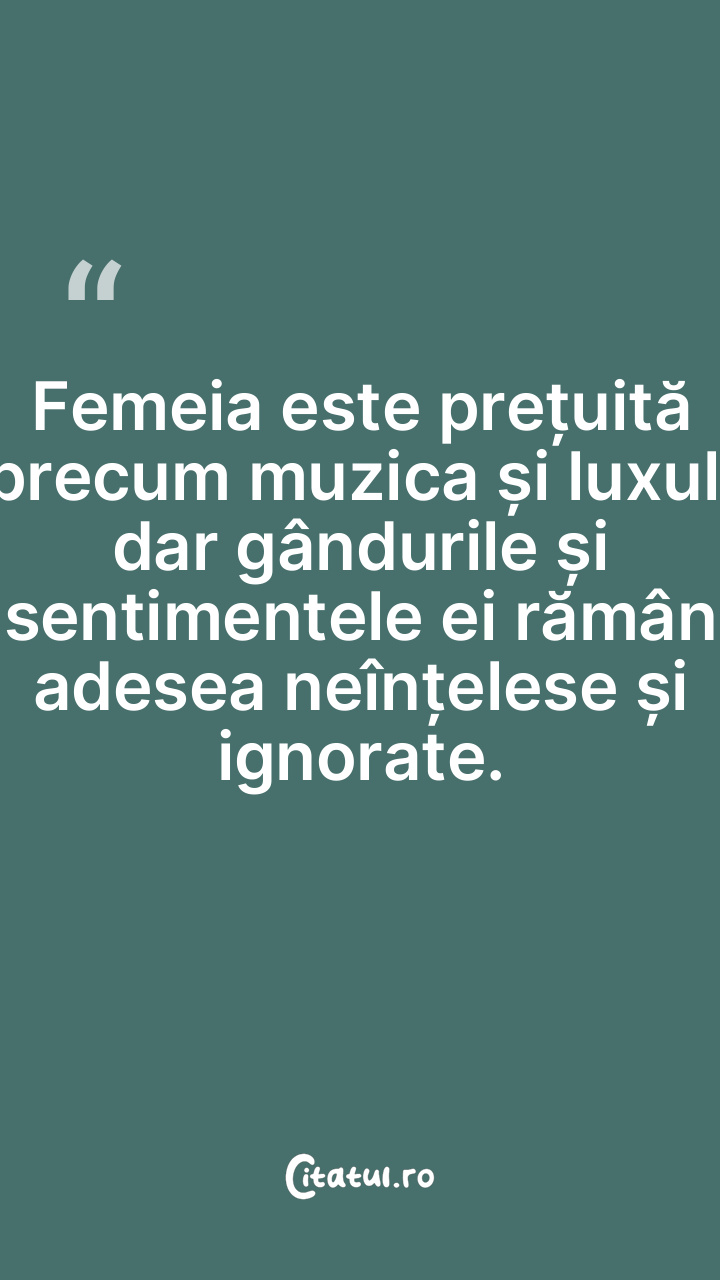 Femeia este prețuită precum muzica și luxul, dar gândurile și sentimentele ei rămân adesea neînțelese și ignorate.