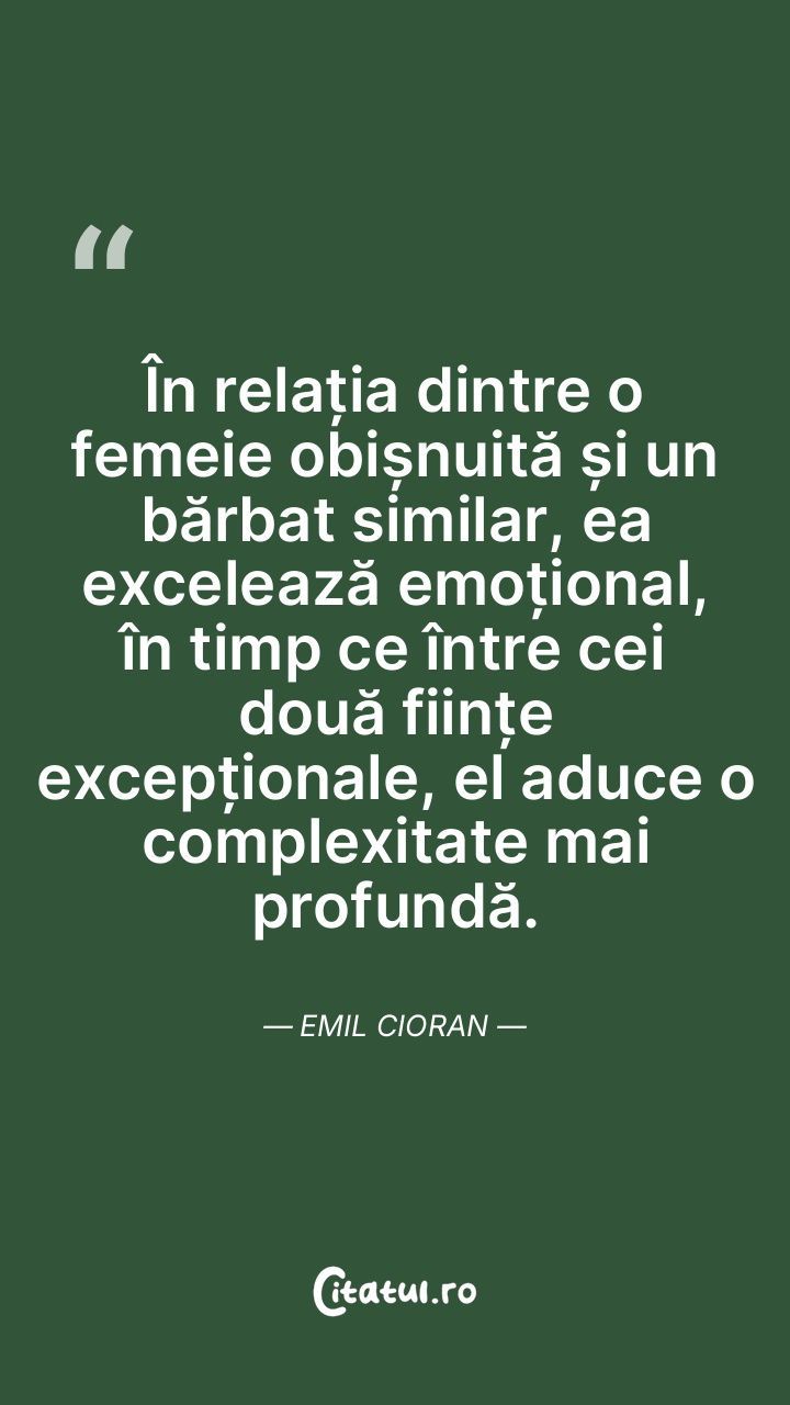 În relația dintre o femeie obișnuită și un bărbat similar, ea excelează emoțional, în timp ce între cei două ființe excepționale, el aduce o complexitate mai profundă. Emil Cioran