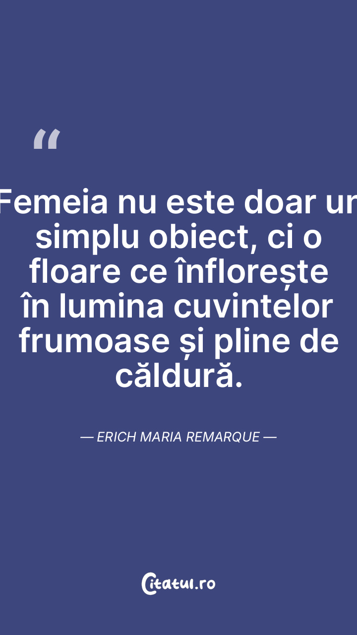 Femeia nu este doar un simplu obiect, ci o floare ce înflorește în lumina cuvintelor frumoase și pline de căldură. Erich Maria Remarque