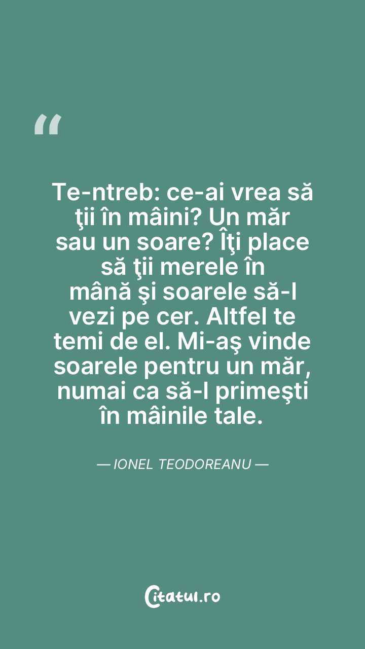 Te-ntreb: ce-ai vrea să ţii în mâini? Un măr sau un soare? Îţi place să ţii merele în mână şi soarele să-l vezi pe cer. Altfel te temi de el. Mi-aş vinde soarele pentru un măr, numai ca să-l primeşti în mâinile tale. Ionel Teodoreanu