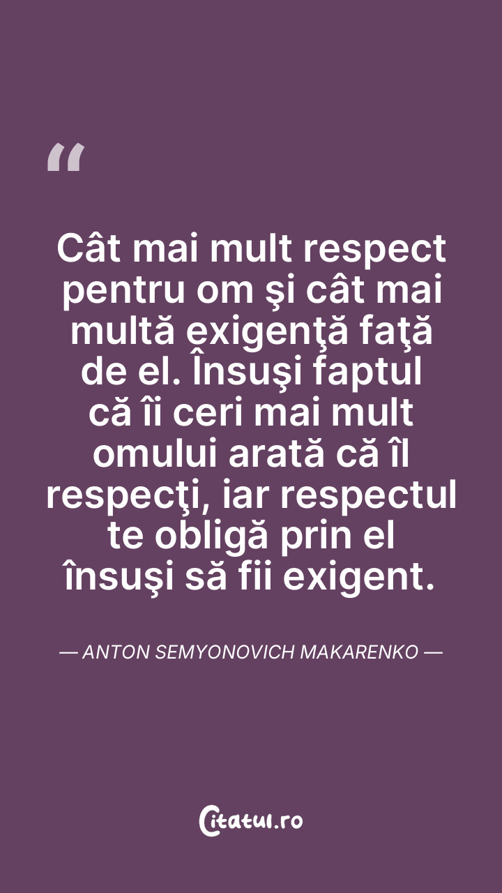 Cât mai mult respect pentru om şi cât mai multă exigenţă faţă de el. Însuşi faptul că îi ceri mai mult omului arată că îl respecţi, iar respectul te obligă prin el însuşi să fii exigent. Anton Semyonovich Makarenko