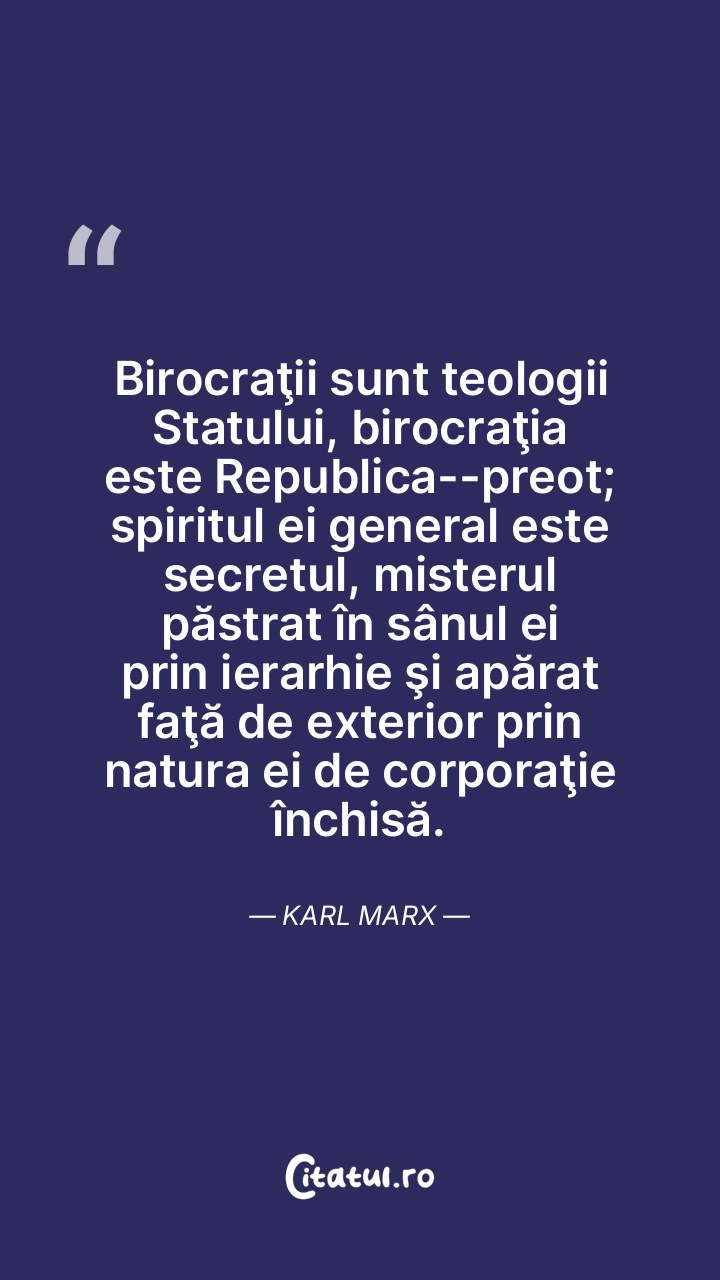 Birocraţii sunt teologii Statului, birocraţia este Republica-preot; spiritul ei general este secretul, misterul păstrat în sânul ei prin ierarhie şi apărat faţă de exterior prin natura ei de corporaţie închisă. Karl Marx