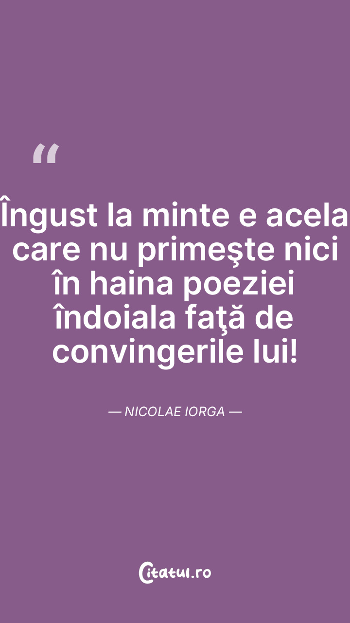 Îngust la minte e acela care nu primeşte nici în haina poeziei îndoiala faţă de convingerile lui! Nicolae Iorga