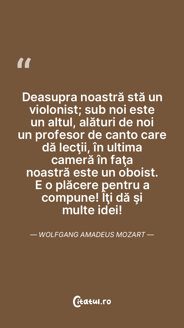 Deasupra noastră stă un violonist; sub noi este un altul, alături de noi un profesor de canto care dă lecţii, în ultima cameră în faţa noastră este un oboist. E o plăcere pentru a compune! Îţi dă şi multe idei! Wolfgang Amadeus Mozart