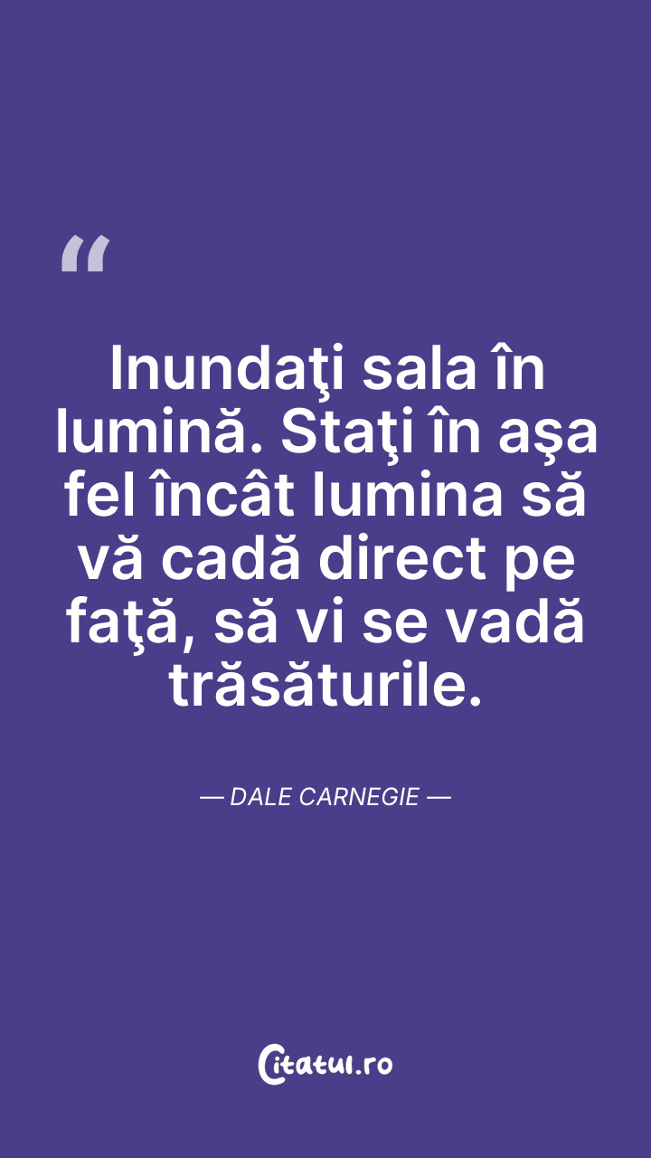 Inundaţi sala în lumină. Staţi în aşa fel încât lumina să vă cadă direct pe faţă, să vi se vadă trăsăturile. Dale Carnegie