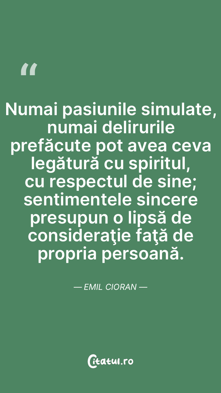 Numai pasiunile simulate, numai delirurile prefăcute pot avea ceva legătură cu spiritul, cu respectul de sine; sentimentele sincere presupun o lipsă de consideraţie faţă de propria persoană. Emil Cioran