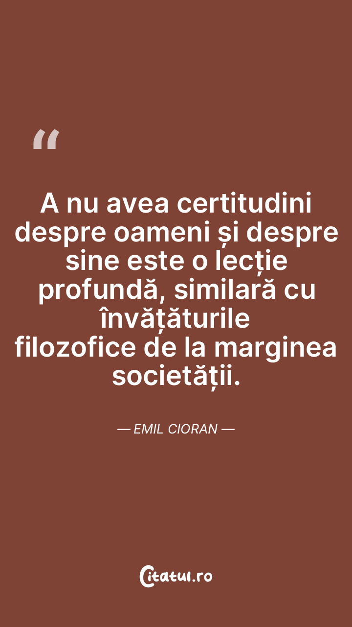 A nu avea certitudini despre oameni și despre sine este o lecție profundă, similară cu învățăturile filozofice de la marginea societății. Emil Cioran