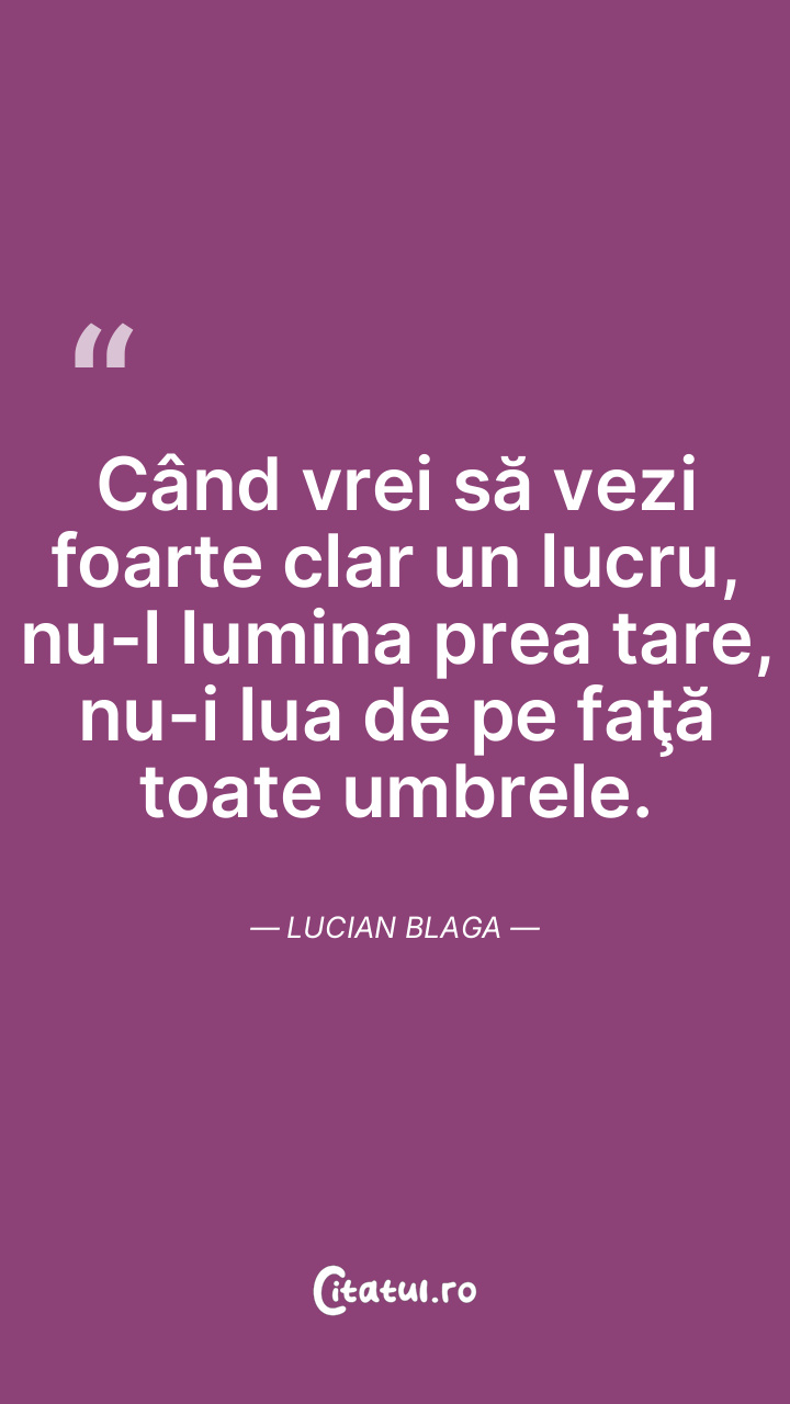 Când vrei să vezi foarte clar un lucru, nu-l lumina prea tare, nu-i lua de pe faţă toate umbrele. Lucian Blaga