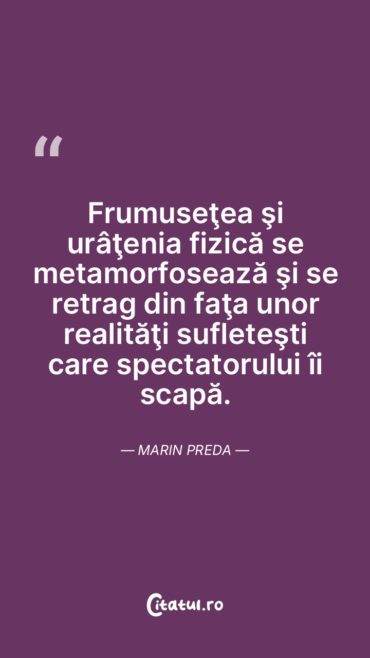 Frumuseţea şi urâţenia fizică se metamorfosează şi se retrag din faţa unor realităţi sufleteşti care spectatorului îi scapă. Marin Preda