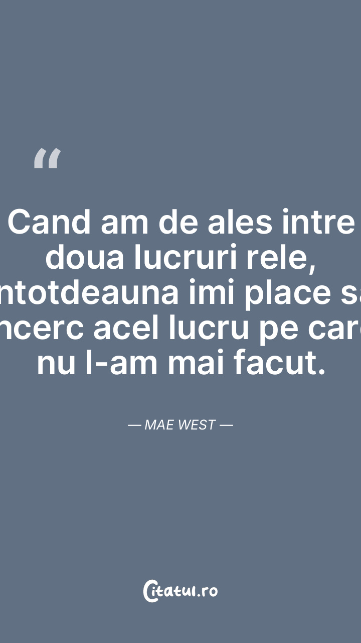 Cand am de ales intre doua lucruri rele, intotdeauna imi place sa incerc acel lucru pe care nu l-am mai facut. Mae West