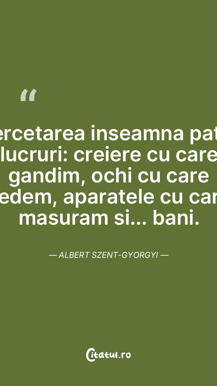 Cercetarea inseamna patru lucruri: creiere cu care gandim, ochi cu care vedem, aparatele cu care masuram si... bani. Albert Szent-Gyorgyi