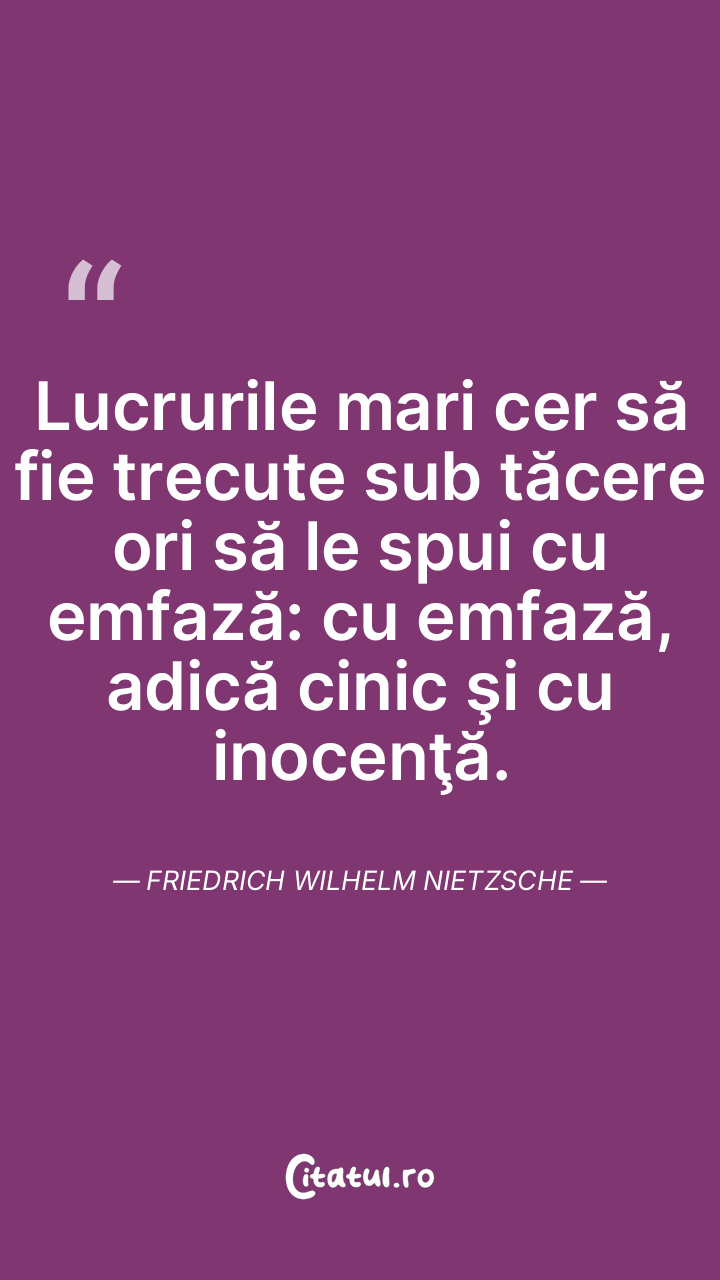 Lucrurile mari cer să fie trecute sub tăcere ori să le spui cu emfază: cu emfază, adică cinic şi cu inocenţă. Friedrich Wilhelm Nietzsche