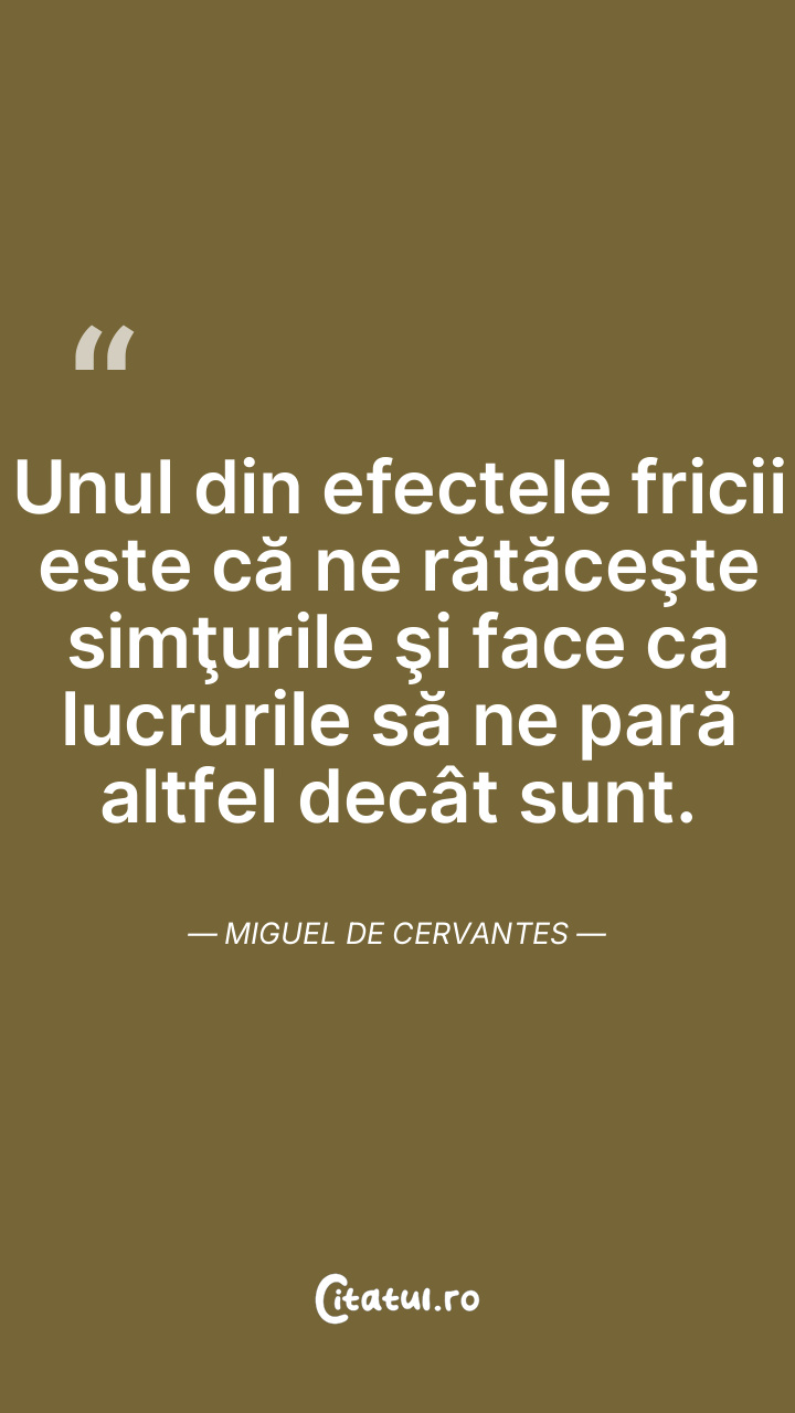 Unul din efectele fricii este că ne rătăceşte simţurile şi face ca lucrurile să ne pară altfel decât sunt. Miguel de Cervantes