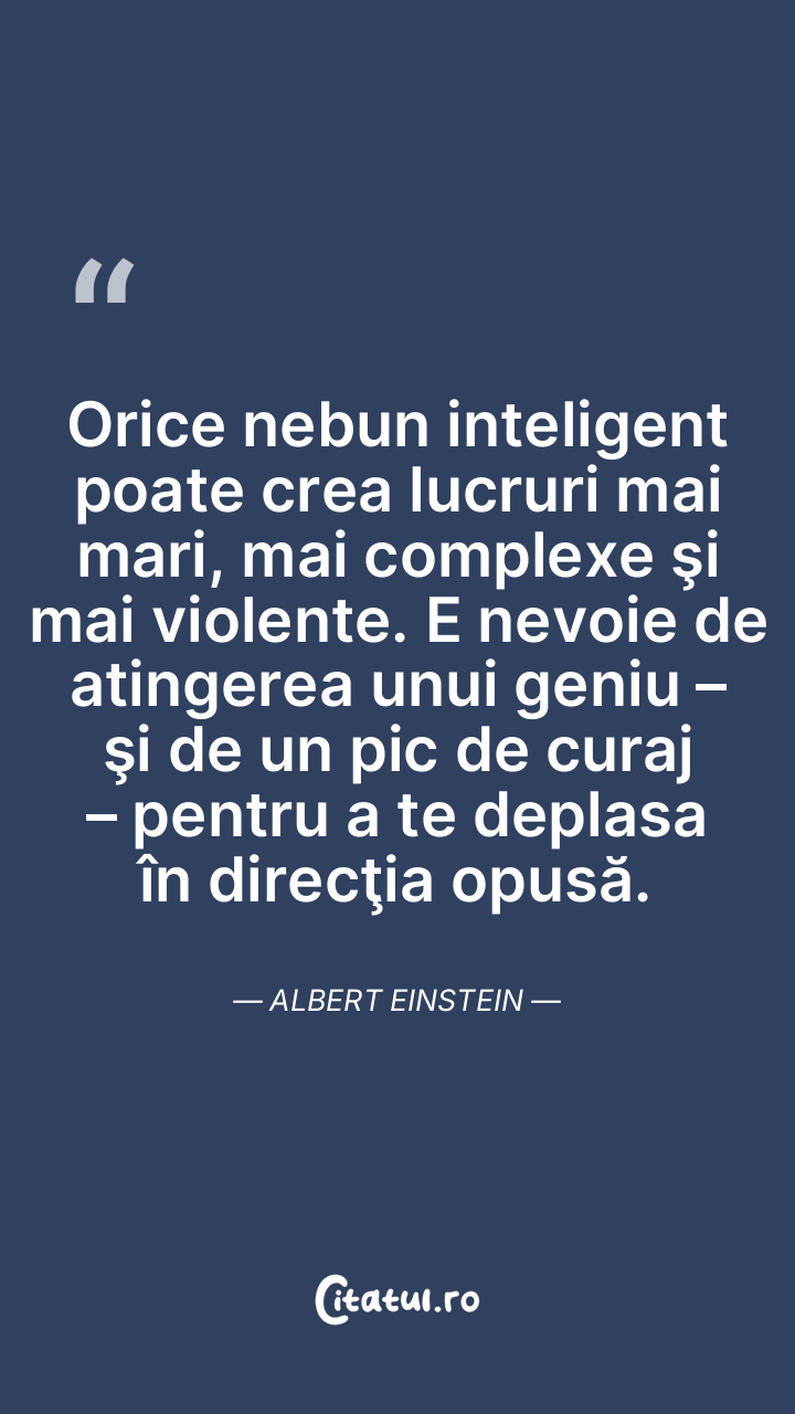 Orice nebun inteligent poate crea lucruri mai mari, mai complexe şi mai violente. E nevoie de atingerea unui geniu – şi de un pic de curaj – pentru a te deplasa în direcţia opusă. Albert Einstein