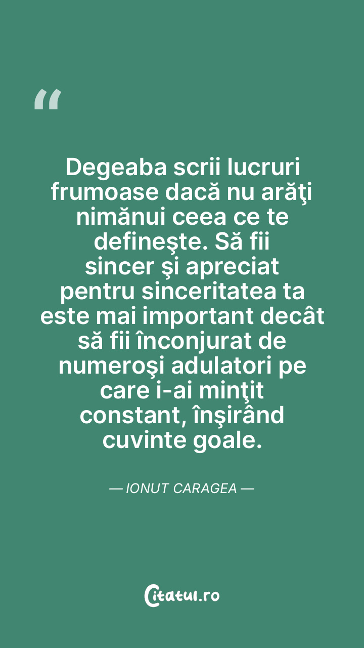 Degeaba scrii lucruri frumoase dacă nu arăţi nimănui ceea ce te defineşte. Să fii sincer şi apreciat pentru sinceritatea ta este mai important decât să fii înconjurat de numeroşi adulatori pe care i-ai minţit constant, înşirând cuvinte goale. Ionut Caragea