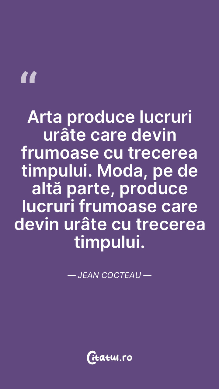 Arta produce lucruri urâte care devin frumoase cu trecerea timpului. Moda, pe de altă parte, produce lucruri frumoase care devin urâte cu trecerea timpului. Jean Cocteau