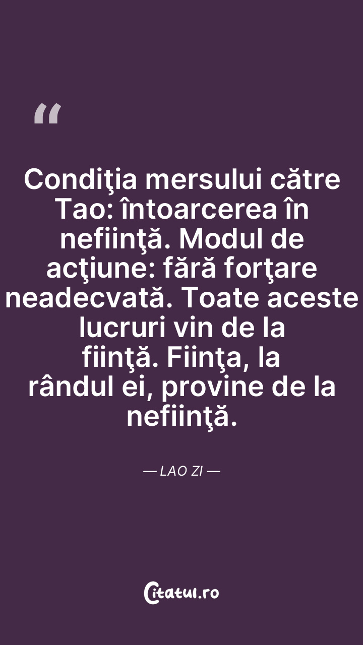 Condiţia mersului către Tao: întoarcerea în nefiinţă. Modul de acţiune: fără forţare neadecvată. Toate aceste lucruri vin de la fiinţă. Fiinţa, la rândul ei, provine de la nefiinţă. Lao Zi