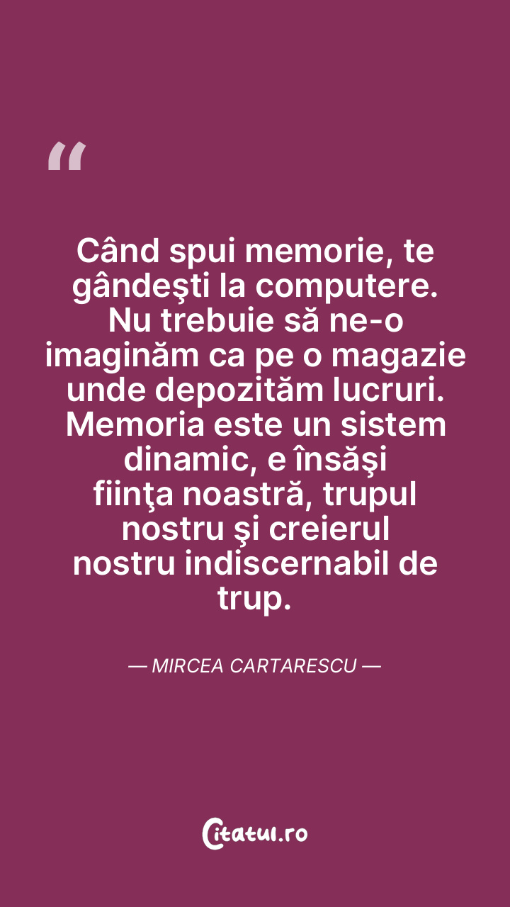 Când spui memorie, te gândeşti la computere. Nu trebuie să ne-o imaginăm ca pe o magazie unde depozităm lucruri. Memoria este un sistem dinamic, e însăşi fiinţa noastră, trupul nostru şi creierul nostru indiscernabil de trup. Mircea Cartarescu