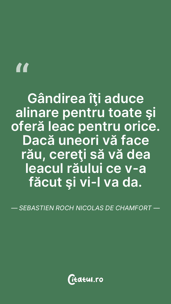 Gândirea îţi aduce alinare pentru toate şi oferă leac pentru orice. Dacă uneori vă face rău, cereţi să vă dea leacul răului ce v-a făcut şi vi-l va da. Sebastien Roch Nicolas de Chamfort