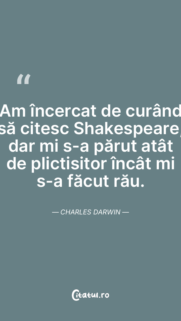 Am încercat de curând să citesc Shakespeare, dar mi s-a părut atât de plictisitor încât mi s-a făcut rău. Charles Darwin