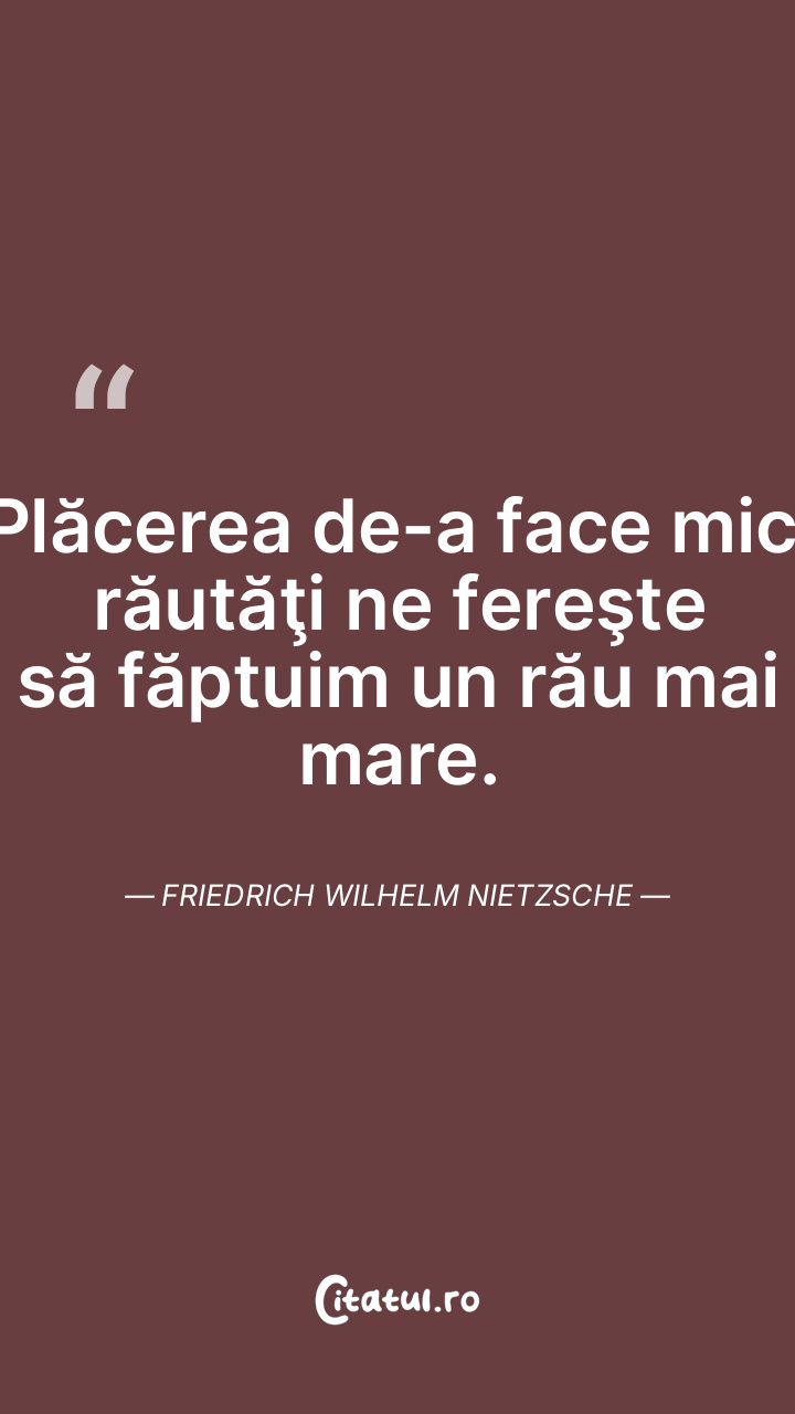 Plăcerea de-a face mici răutăţi ne fereşte să făptuim un rău mai mare. Friedrich Wilhelm Nietzsche