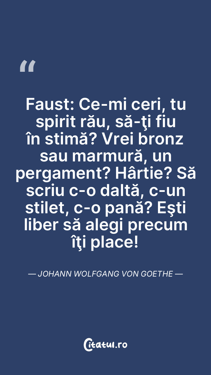 Faust: Ce-mi ceri, tu spirit rău, să-ţi fiu în stimă? Vrei bronz sau marmură, un pergament? Hârtie? Să scriu c-o daltă, c-un stilet, c-o pană? Eşti liber să alegi precum îţi place! Johann Wolfgang von Goethe