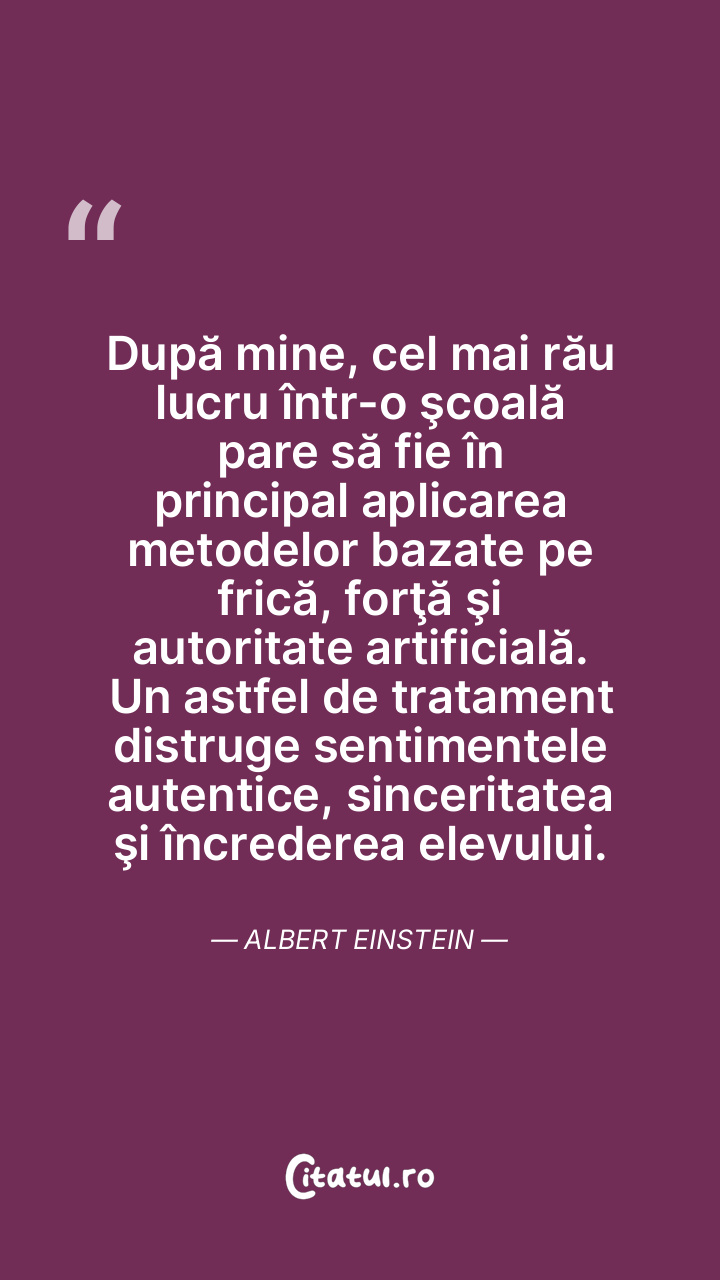 După mine, cel mai rău lucru într-o şcoală pare să fie în principal aplicarea metodelor bazate pe frică, forţă şi autoritate artificială. Un astfel de tratament distruge sentimentele autentice, sinceritatea şi încrederea elevului. Albert Einstein