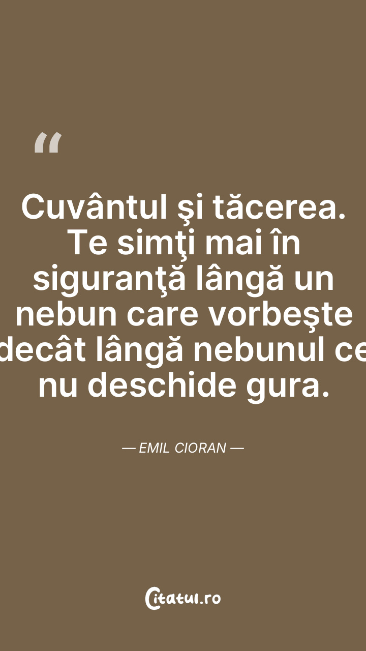 Cuvântul şi tăcerea. Te simţi mai în siguranţă lângă un nebun care vorbeşte decât lângă nebunul ce nu deschide gura. Emil Cioran