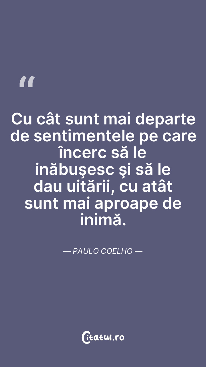Cu cât sunt mai departe de sentimentele pe care încerc să le inăbuşesc şi să le dau uitării, cu atât sunt mai aproape de inimă. Paulo Coelho