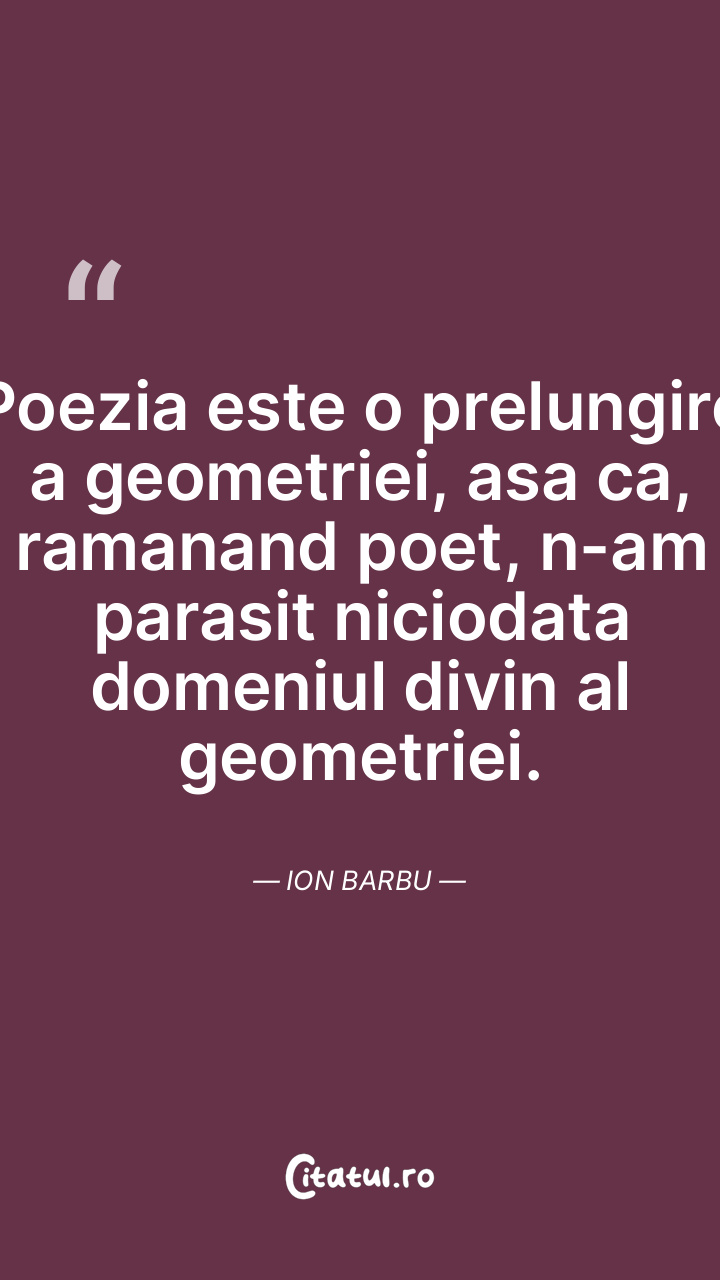 Poezia este o prelungire a geometriei, asa ca, ramanand poet, n-am parasit niciodata domeniul divin al geometriei. Ion Barbu
