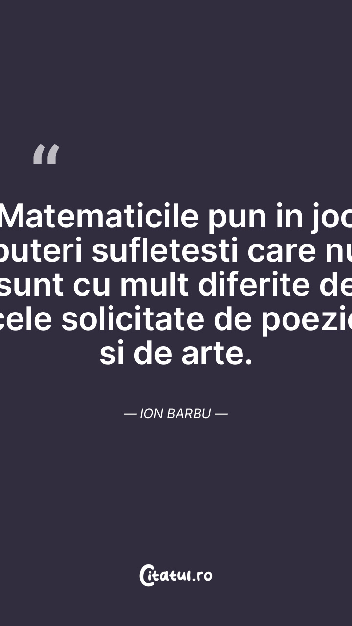Matematicile pun in joc puteri sufletesti care nu sunt cu mult diferite de cele solicitate de poezie si de arte. Ion Barbu